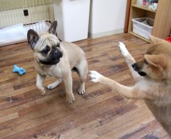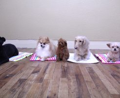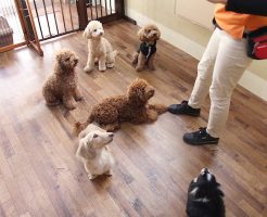 今日は5匹のわんちゃん達でレッスンを行いました! 新たにトイプードルの”小瑚ちゃん”が参加してくれました♪ 遊びの時間:他犬とのコミュニケーションを学ぶ 午前中は”遊びの時間”として、他犬との関わり方を学びます!遊びたい・・・