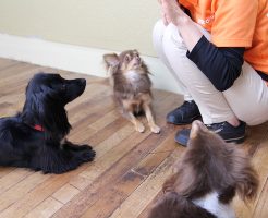 今日の預かりレッスンには3匹のわんちゃんが参加しました! 遊びの時間 しつけの時間 午後のしつけの時間では個々の課題をトレーニング! チャビくん チャビくんは待ての応用として、”周りを歩いても”、”目の前でしゃがんでも”・・・